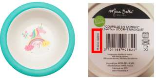 Les autorités de sécurité alimentaire luxembourgeoises viennent d’être informées par la société Auchan que le produit COUPELLE RONDE BAMBOU Ø 15,5 CM LICORNE MAGIQUE de la marque « Mesa Bella » présentant une migration trop élevée en en mélamine et en formaldéhyde a