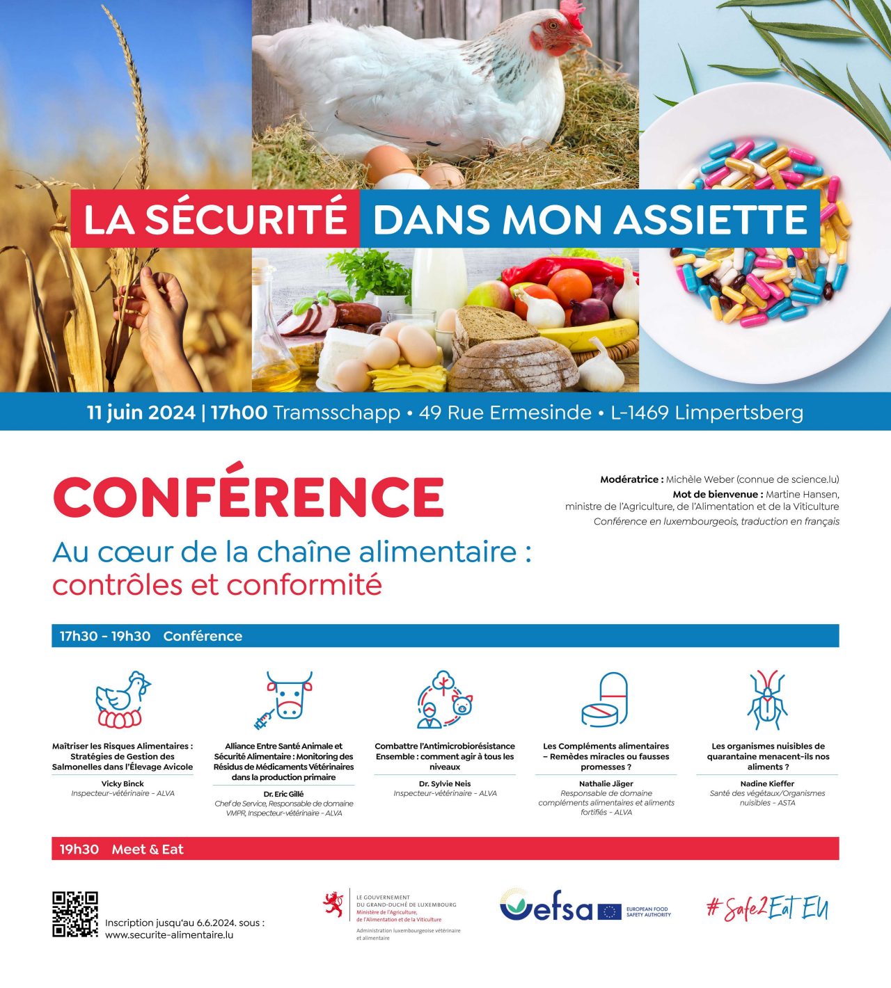 L’Administration luxembourgeoise vétérinaire et alimentaire en tant que Point Focal de l’EFSA (Autorité européenne de sécurité des aliments) a le plaisir de vous inviter à la conférence « la sécurité dans mon assiette » organisée dans le cadre de la Journée internationale de la sécurité sanitaire des aliments.